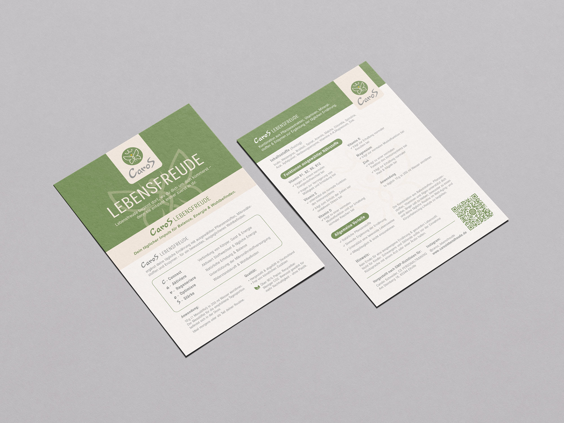 Für CaroS Lebensfreude habe ich das Logo, die Corporate Identity und einen Flyer gestaltet. Das Produkt ist ein Nahrungsergänzungsmittel, das das Wohlbefinden und die Lebensfreude im Alltag fördert – und genau diese positive Energie spiegelt sich auch im Design wider. Die Kundin Caro strahlt selbst große Lebensfreude aus und brennt für ihr Produkt, was die Zusammenarbeit von Anfang an sehr inspirierend gemacht hat. Ich entwickelte vier unterschiedliche Logovarianten, die thematisch zum Produkt passten, und eine davon landete sofort einen Volltreffer: Caro sagte direkt, sie habe sich „verliebt“ und wollte genau dieses Logo. Nach wenigen kleinen Anpassungen blieb es bei diesem Erstentwurf, da er perfekt zur Marke passte. Auf dieser Grundlage entstand ein stimmiges Erscheinungsbild, das sich konsequent in Farben, Formen und dem Flyer wiederfindet. Die Arbeit mit Caro macht großen Spaß, und ich freue mich darauf, sie auch weiterhin bei weiteren Designs zu begleiten.