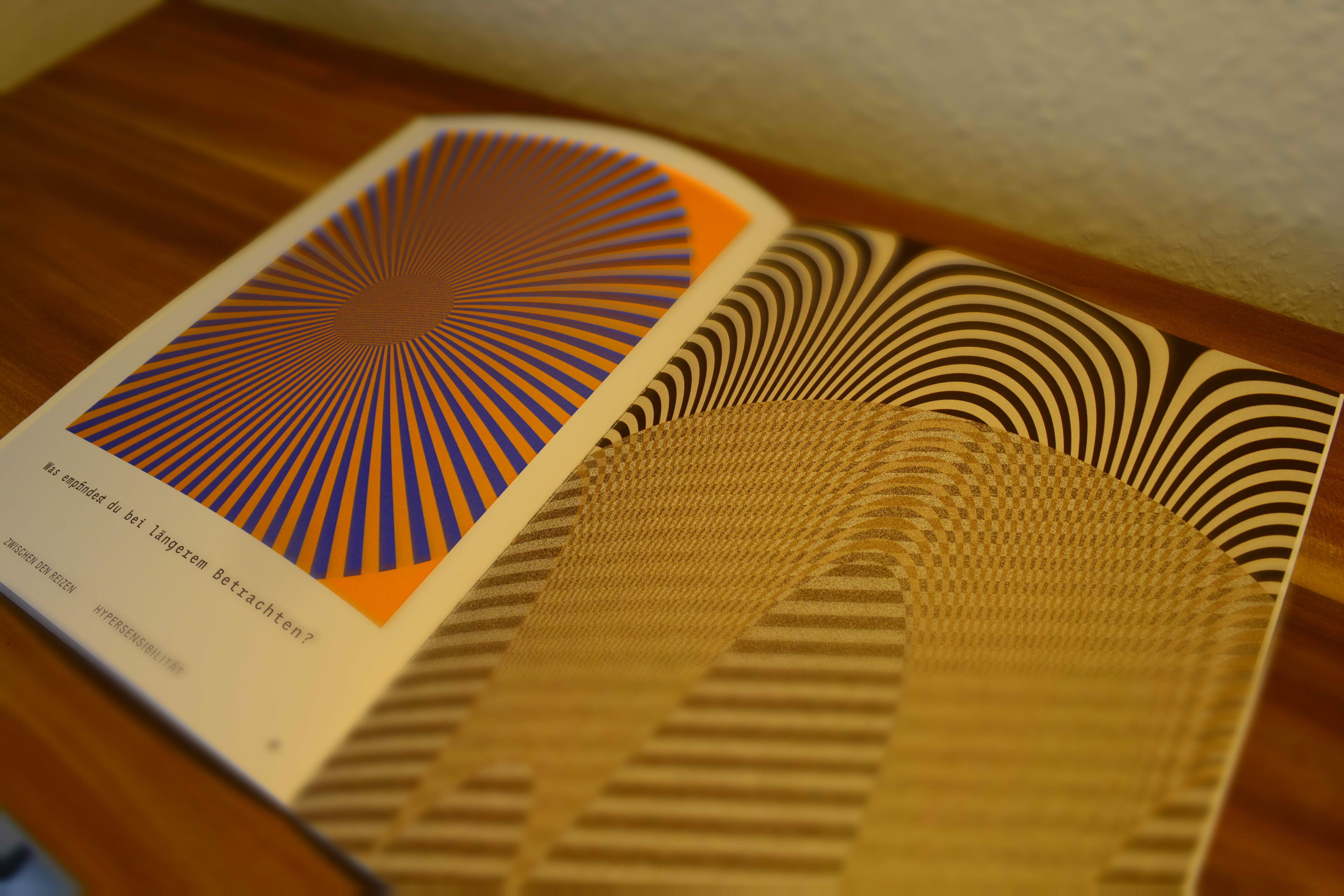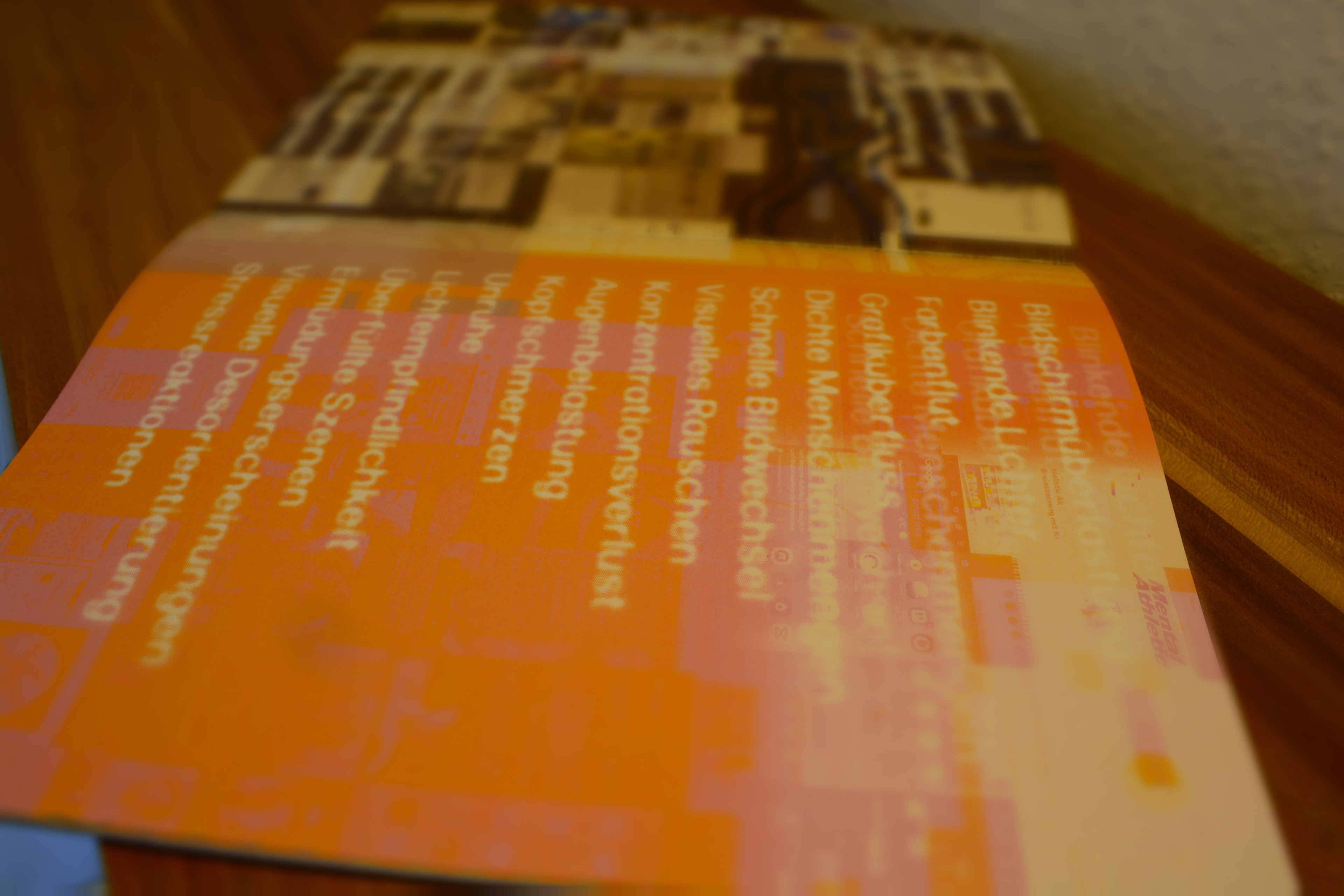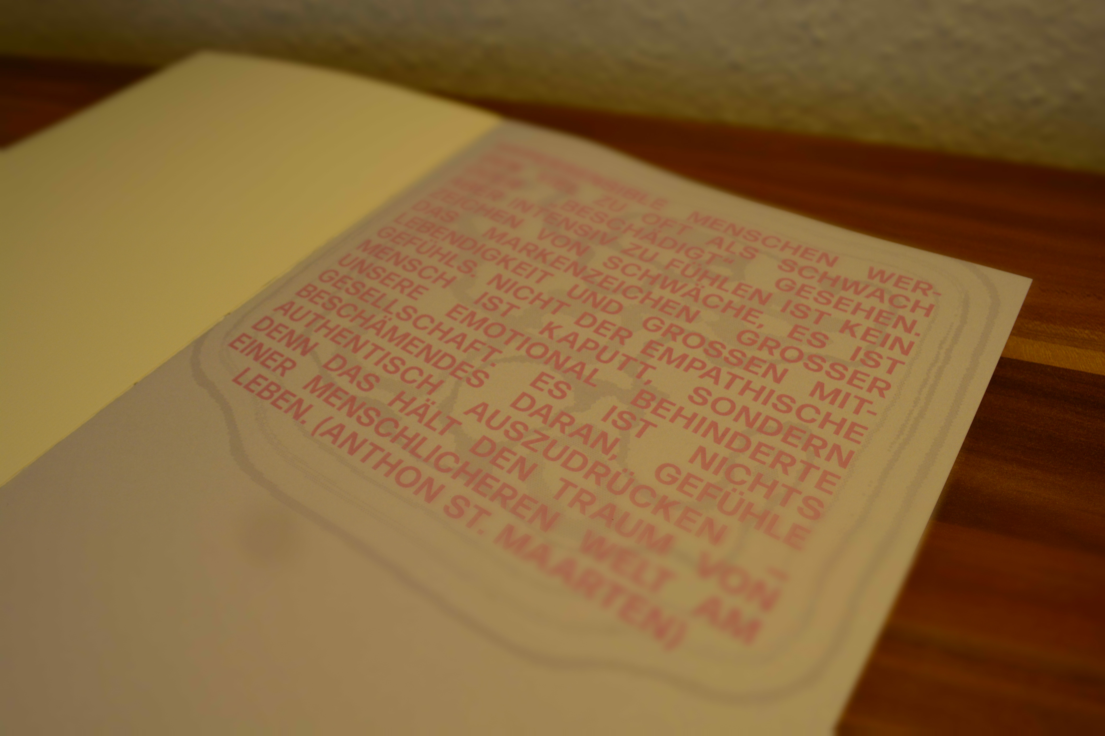 Dieses Projekt visualisiert die verschiedenen Formen der Überreizung bei hypersensiblen Personen. Mittels Fotografie, digitaler Bildbearbeitung und experimentellen Gestaltungsansätzen werden die sensorischen und emotionalen Auswirkungen dargestellt. Das Buch besteht aus sieben Kapiteln, wobei der Schwerpunkt auf visueller, auditiver, taktiler und emotionaler Überreizung liegt. Ein durchdachtes Farbkonzept unterstützt die Darstellung: Rosa und Schwarz für die allgemeine Thematik, ergänzt durch spezifische Farben für jede Überreizung. Unterschiedliche fotografische Techniken und kreative Gestaltungselemente, kombiniert mit handgenähtem Buchdesign und einer Auswahl verschiedenster Papiere, machen die Vielschichtigkeit der Reize visuell und haptisch erfahrbar.